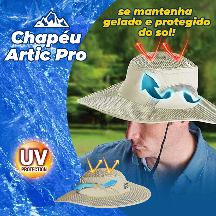 Desenvolvido com tecnologia militar americana, o chapéu Artic possui um sistema interno de resfriamento evaporativo.